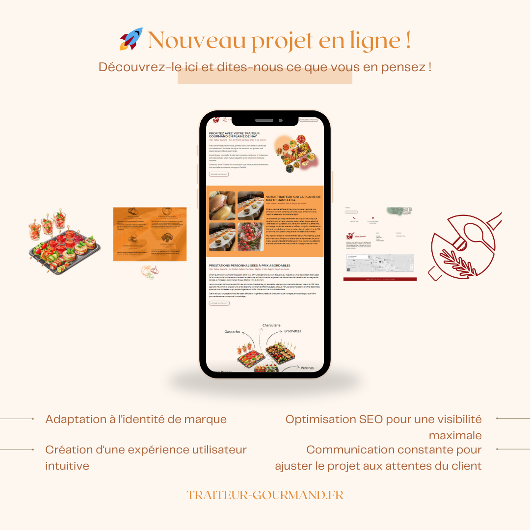 L’idée de Traiteur Gourmand a commencé lorsqu’un client m’a contacté pour discuter de son projet. Lors de notre premier rendez-vous, nous avons échangé sur ses attentes et ses besoins. À partir de là, j’ai proposé plusieurs designs. Ce processus a impliqué de nombreux échanges pour affiner et perfectionner les idées jusqu’à obtenir le projet final.