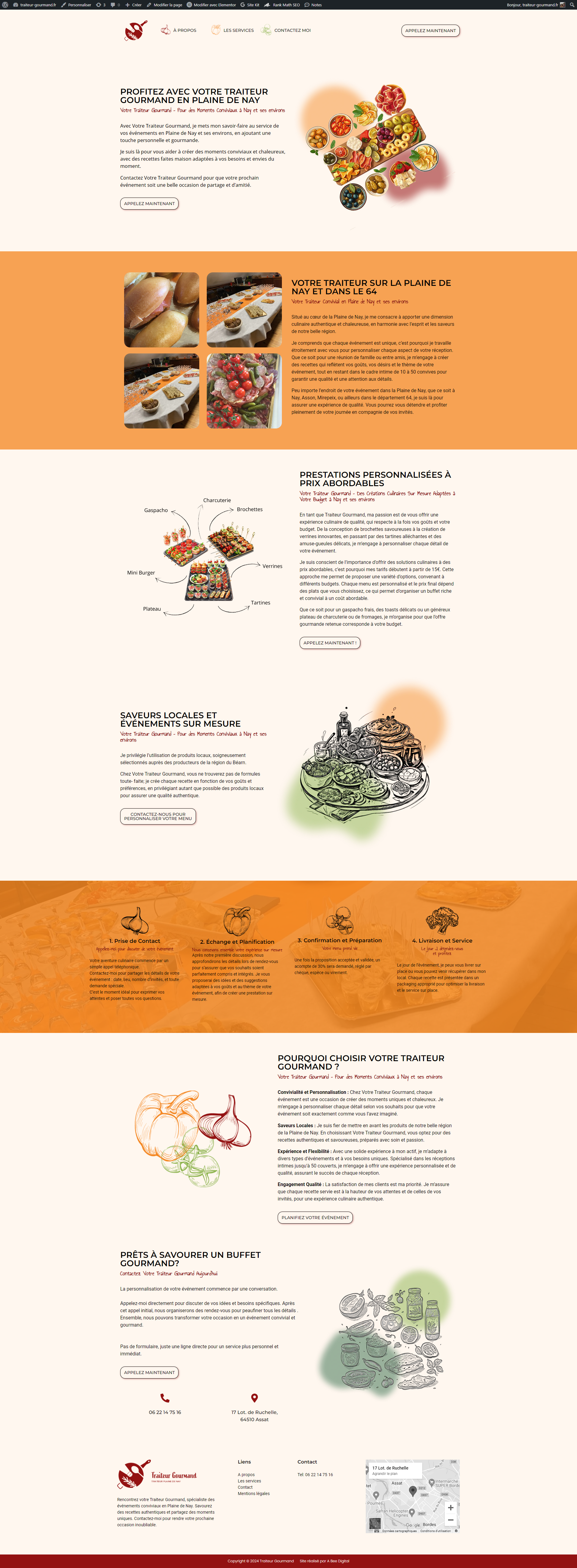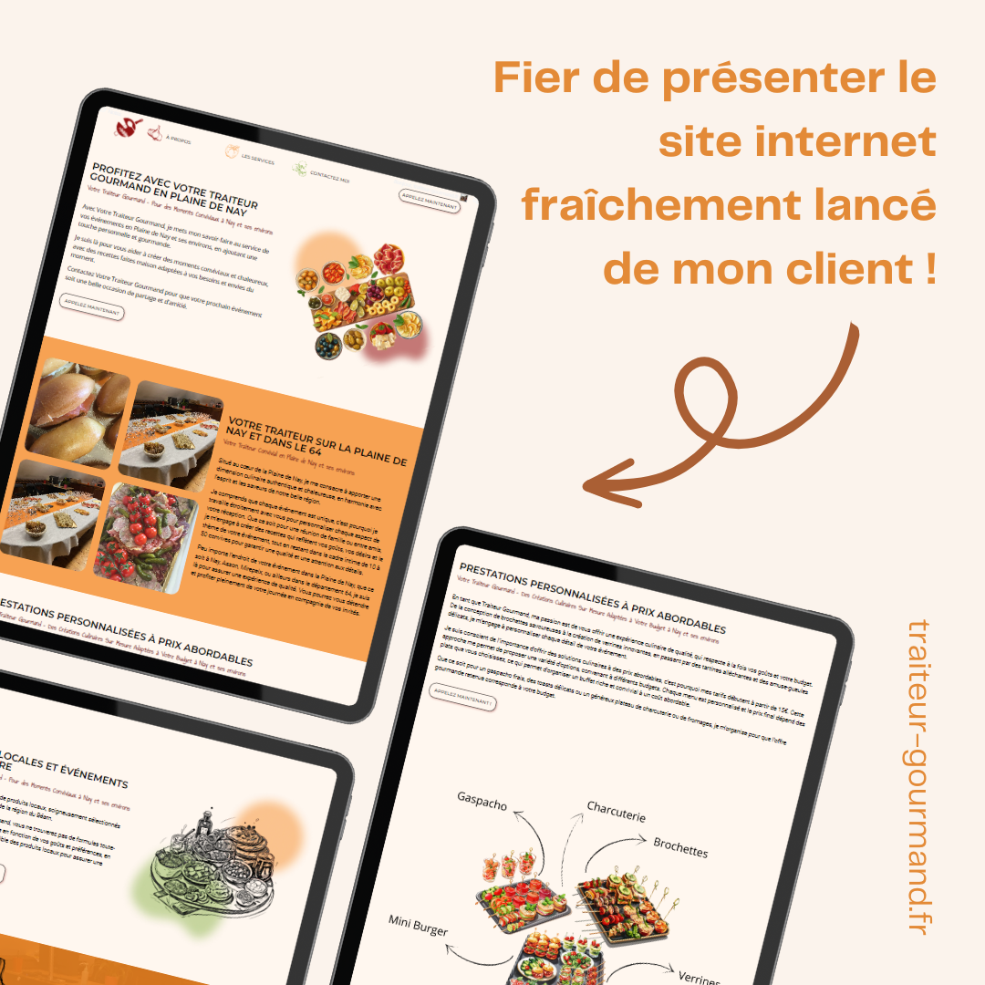 Le site web de Traiteur Gourmand est pensé comme une page unique, permettant aux visiteurs d'accéder directement à toutes les informations importantes. Il invite à découvrir l'univers du traiteur, mettant en avant la proximité et l'échange avec les clients. Chaque section est conçue pour être à la fois informative et immersive, offrant une expérience utilisateur fluide et agréable.