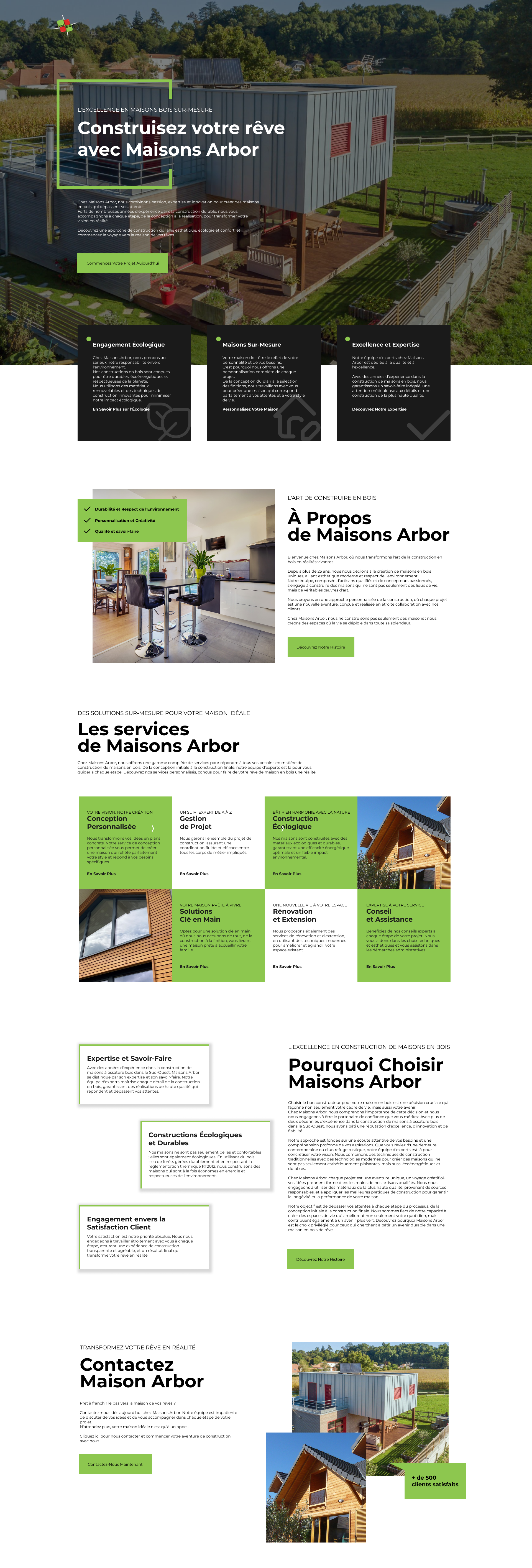 L'objectif était de transformer le site de Maison Arbor pour mieux refléter leur expertise en construction de maisons en bois et d'améliorer leur visibilité en ligne. Inspirée par leur savoir-faire artisanal et leur engagement envers la durabilité, j'ai conçu un design qui incarne ces valeurs tout en optimisant le site pour les moteurs de recherche.